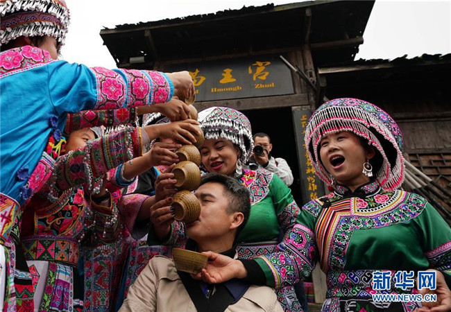 10月14日,在興文石海世界地質(zhì)公園內(nèi),工作人員為遠(yuǎn)道而來(lái)的游客敬酒。