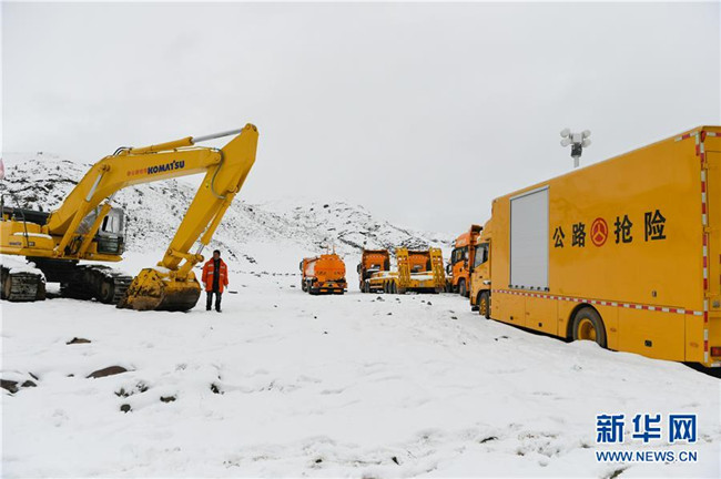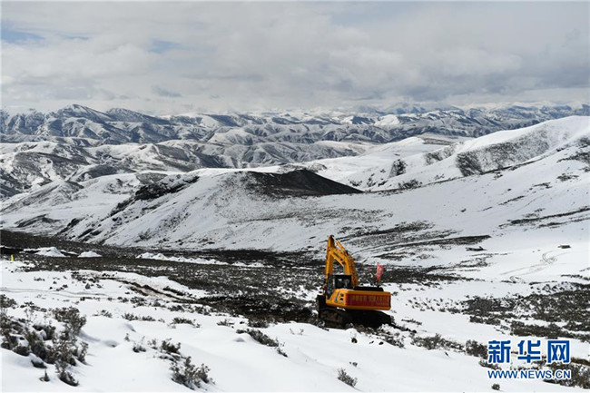 工作人員駕駛大型機械在昌都市江達縣的高山牧場上搶通道路(10月14日攝)。新華社記者 劉東君 攝