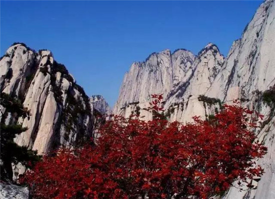 華山的紅葉浪漫而熾烈,她使蕭瑟的群山充滿了生機(jī)和活力。那些五角楓樹和黃櫨葉子在薄暮中分外地紅著,在陽光中到處閃動(dòng)著鮮紅的翅膀,想要與彩霞或夕陽一起飛翔。人們猜想,那一定是調(diào)皮的小廝盜了弄玉的胭脂潑在了山坡上,要不然,華山的紅葉紅葉何以會(huì)漫山遍野,何以會(huì)如此熾紅而且多情。