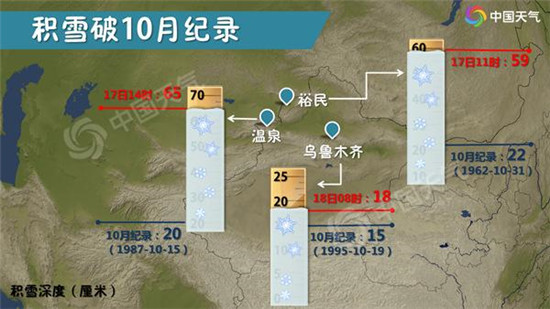 受強(qiáng)冷空氣影響,17日新疆伊犁河谷平原地區(qū)出現(xiàn)近28年以來最早大范圍初雪,首府烏魯木齊也降下今年下半年的初雪,較常年初雪日10月23日(1981-2010年)略早。昨天早晨降雪持續(xù),8時(shí)烏魯木齊積雪已經(jīng)達(dá)到18厘米,打破了當(dāng)?shù)?0月份的積雪紀(jì)錄,并且最低氣溫首度“破冰”只有-1℃。受其影響嗎,新疆暴雪、大風(fēng)、寒潮、霜凍、道路結(jié)冰、沙塵暴6個(gè)預(yù)警齊發(fā),惡劣天氣為農(nóng)牧業(yè)生產(chǎn)、林果業(yè)、交通旅游、城市運(yùn)行等帶來了不利影響。