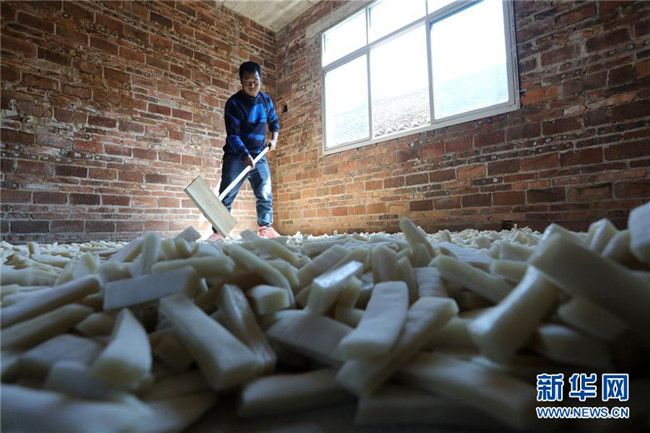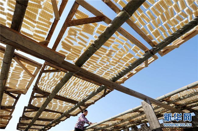 11月4日,在貴州省黎平縣中潮鎮(zhèn)佳所侗寨,村民在晾曬“侗果”粑塊。 近日,貴州省黔東南苗族侗族自治州黎平縣中潮鎮(zhèn)佳所侗寨的村民們搶抓晴好天氣,忙著制作、晾曬“侗果”,侗寨里一派忙碌。“侗果”是當(dāng)?shù)囟弊逋捅貍涞奶厣朗?,是將蒸熟的糯米切成小粑塊后,再經(jīng)曬干、油炸、澆紅糖和上芝麻等工序制作而成。 新華社發(fā)(楊代富 攝