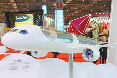 進(jìn)口博覽會(huì)上展出的ARJ21支線客機(jī)模型。本版攝影 記者 李向雨