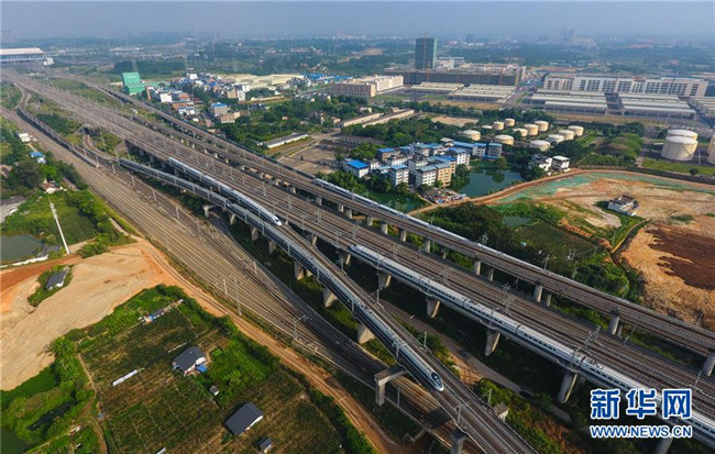 這是廣西南寧動(dòng)車所內(nèi)準(zhǔn)備發(fā)往各地的動(dòng)車組列車(7月1日無人機(jī)拍攝)。