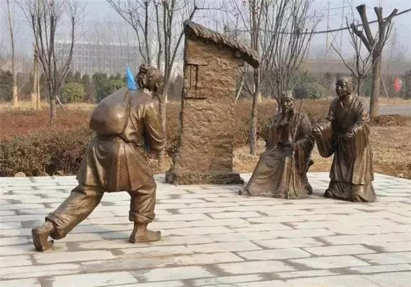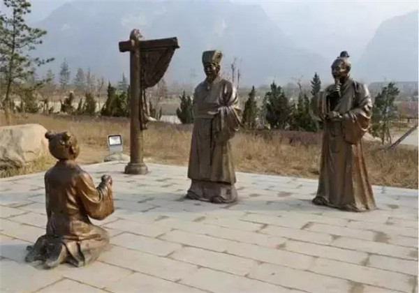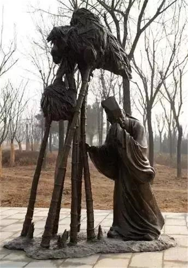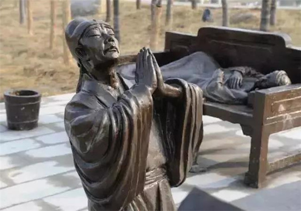 丁蘭,相傳為東漢時(shí)期河內(nèi)人,幼年時(shí)父母雙亡,他經(jīng)常思念父母的養(yǎng)育之恩,于是用木頭刻成雙親的雕像,事之如生,凡事均和木像商議,每日三餐敬過雙親后自己方才食用,出門前一定稟告,回家后一定面見,從不懈怠。久之,其妻對(duì)木像便不太恭敬了,竟好奇地用針刺木像的手指,而木像的手指居然有血流出。丁蘭回家見木像眼中垂淚,問知實(shí)情,遂將妻子休棄。