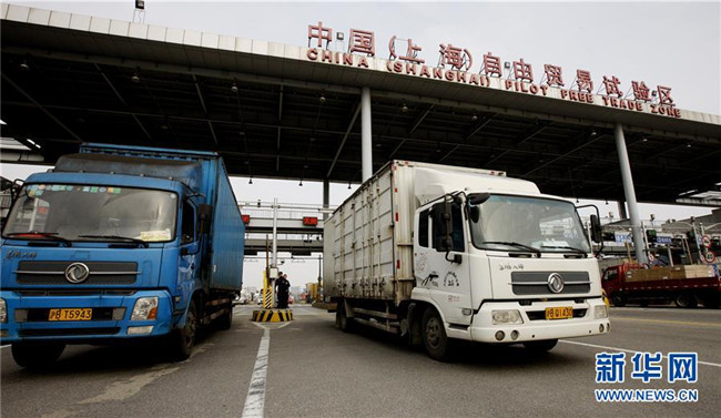 完成無紙化通關(guān)手續(xù)的卡車駛出位于上海外高橋的自貿(mào)區(qū)車輛出入口(2017年1月10日攝)。新華社記者方喆攝