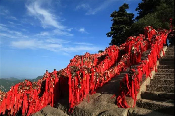 華山是愛情山,“洞房”一詞就源于華山西峰。相傳春秋時期在華山修行的吹簫人簫史和秦穆公的女兒弄玉就是在華山西峰相識相愛,由于山上沒有房屋,就在崖壁上鑿洞成婚,“洞房”一詞由此誕生。 如今來愛情山的游客都有了一個約定俗成的習慣,“進山先拜廟,相愛神知道”,“一把連心鎖,鎖定你和我”。相愛的情侶,不分年齡,不分國籍,不分信仰,來到山上都要進香上鎖,讓華山見證彼此的真心與愛意,祈求幸福美滿,人生甜蜜。