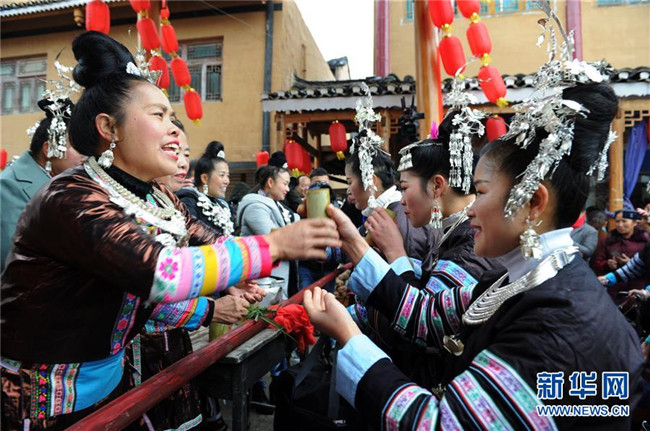 12月9日,貴州省黎平縣中潮鎮(zhèn)佳所侗寨的村民在攔門(mén)敬酒?!⌒氯A社發(fā)(楊文斌 攝)