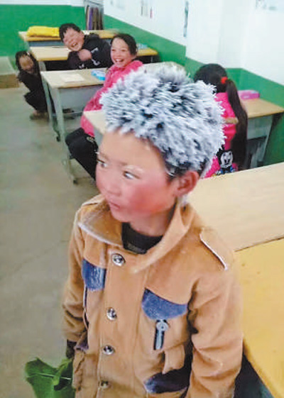 去年初,小滿因為頭頂著冰霜上學而被稱為“冰花男孩”?!≠Y料圖片 |