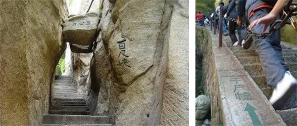 千尺幢,是經(jīng)華山峪登主峰的必經(jīng)之道。這里原為一崖間裂隙,直立70度,后來人們沿隙鑿?fù)爻陕?,有石階370級(jí),階寬僅容半足,游人登臨時(shí),仰視一線天,俯視若臨深井。百尺峽在“千尺幢上,也是巖隙險(xiǎn)道,有石階91級(jí),游人須挽索而上。有詩云:“幢去峽復(fù)來,天險(xiǎn)不可瞬,雖云百尺峽,一尺一千仞”。