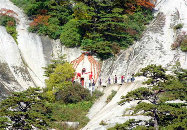 相傳秦穆公的女兒弄玉與居住在華山明星崖的吹簫人蕭史相愛后,練習辟谷之法,乘龍跨鳳,騰空來至華山,鑿洞成婚并得道成仙,“洞房”一詞也是源于此。情侶們來到這里拍照留念,也是對婚姻的一種向往。