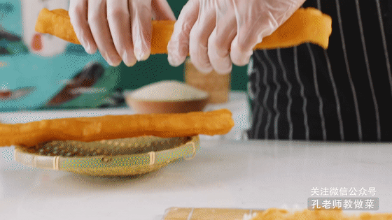 7.老油條從中間掰開,疊放至大根上。(油條一般用涼透了又帶有點韌性的,如果喜歡吃酥脆的話,可要用上熱騰騰的嫩油條。)