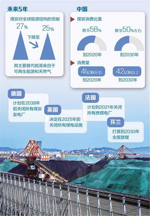 《報告》顯示,未來5年全球煤炭需求將保持穩(wěn)定。歐洲和美國市場煤炭消耗將下降,但其下降的份額將被印度和其他亞洲國家的增長抵消。未來5年,煤炭對全球能源結(jié)構(gòu)的貢獻(xiàn)將從27%下降至25%,其主要替代能源來自于可再生能源和天然氣。
