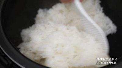 2.電飯鍋選“精煮檔”煮米,待功能結束后揭開蓋子,聞到米飯香氣撲鼻,用飯勺將米飯打散,再燜5分鐘。