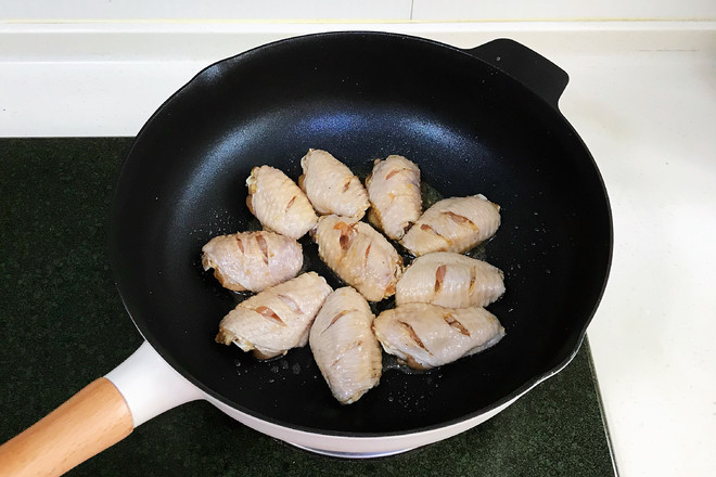 6.腌制好的雞翅,用廚房紙吸干表面的水份,煎制時才能上色。開中火,不粘鍋里倒入少許食用油,油熱后放入雞翅。