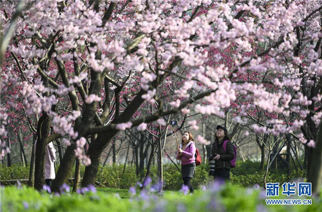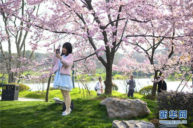 3月13日,游客在武漢東湖櫻園賞櫻拍照。新華社記者 熊琦 攝