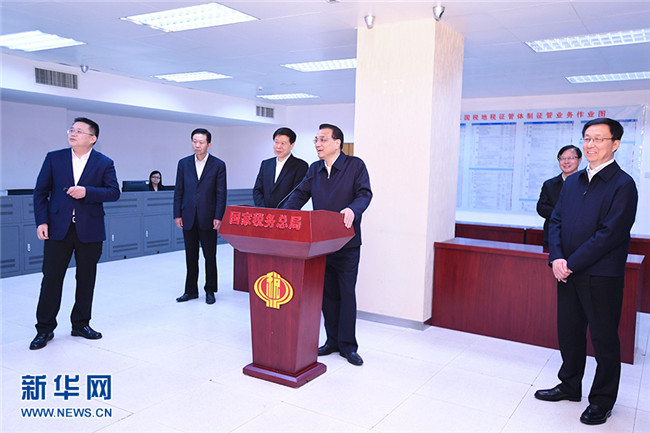 3月21日,中共中央政治局常委、國務院總理李克強到財政部、稅務總局考察,并主持召開座談會。中共中央政治局常委、國務院副總理韓正出席。這是李克強在稅務總局考察。 新華社記者 燕雁 攝