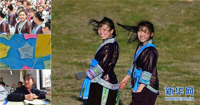這是一張拼版照片:右圖為韋迎春(右)和同學(xué)在一起(2月6日攝);左上圖為韋迎春(中)在家鄉(xiāng)的“打同年”活動(dòng)中(2月7日攝);左中圖為韋迎春在小卡紙上寫下的夢想(3月22日攝);左下圖為韋迎春在課堂上聽課(3月22日攝)。韋迎春來自融水苗族自治縣桿洞鄉(xiāng)堯告村,目前在融水民族高中讀高一。 新華社記者 黃孝邦 攝