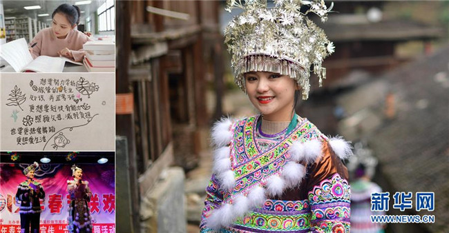 這是一張拼版照片:右圖為楊琳詩瑤(2月16日新華社記者黃孝邦攝);左上圖為楊琳詩瑤在學(xué)校圖書館里學(xué)習(xí)(3月23日攝,楊琳詩瑤供圖);左中圖為楊琳詩瑤在紙上寫下的夢想(3月23日攝,楊琳詩瑤供圖);左下圖為楊琳詩瑤(右)在家鄉(xiāng)主持苗寨的春節(jié)聯(lián)歡晚會(huì)(2月10日新華社記者黃孝邦攝)。楊琳詩瑤是融水苗族自治縣桿洞鄉(xiāng)桿洞村的苗族姑娘,去年以優(yōu)異成績考上廣西民族大學(xué)。 新華社發(fā)