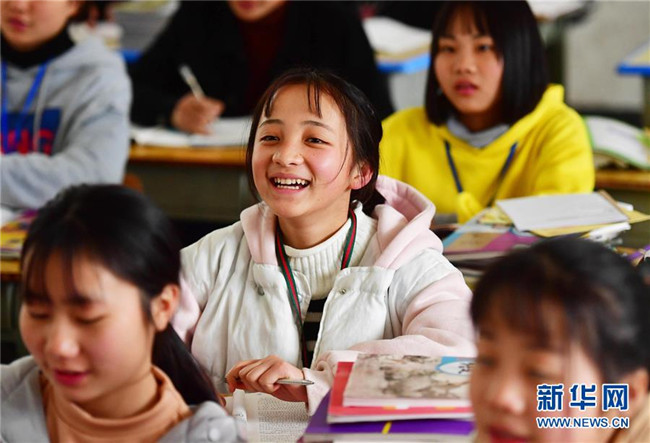 韋蓮秀(中)在課堂上(3月13日攝)。韋蓮秀來自融水苗族自治縣桿洞鄉(xiāng)百秀村,目前在桿洞中學(xué)讀初中。 新華社記者 黃孝邦 攝