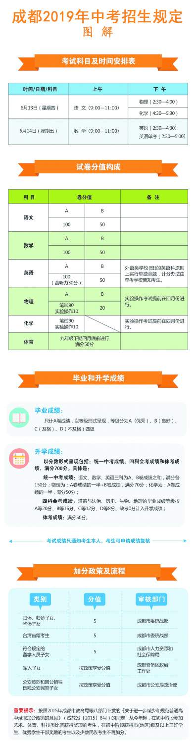 今年中考考試時(shí)間與往年一樣,為6月13日、14日,考試科目和計(jì)分辦法均未作調(diào)整。也即是說,今年中考統(tǒng)一考試科目依然為語(yǔ)文、數(shù)學(xué)、英語(yǔ)、物理、化學(xué)、體育六科。其中,物理、化學(xué)包括實(shí)驗(yàn)操作考試。體育考試以及物理、化學(xué)實(shí)驗(yàn)操作考試在九年級(jí)下期4月底以前,由各區(qū)(市)縣組織進(jìn)行。九年級(jí)結(jié)束時(shí),語(yǔ)、數(shù)、英、物、化五科的畢業(yè)考試與升學(xué)考試一并進(jìn)行,各科筆試考試均為閉卷考試,具體時(shí)間安排詳見圖解。其中,外語(yǔ)類學(xué)校(班),如成外實(shí)外等校的英語(yǔ)科,原則上單獨(dú)命題,統(tǒng)一考試。