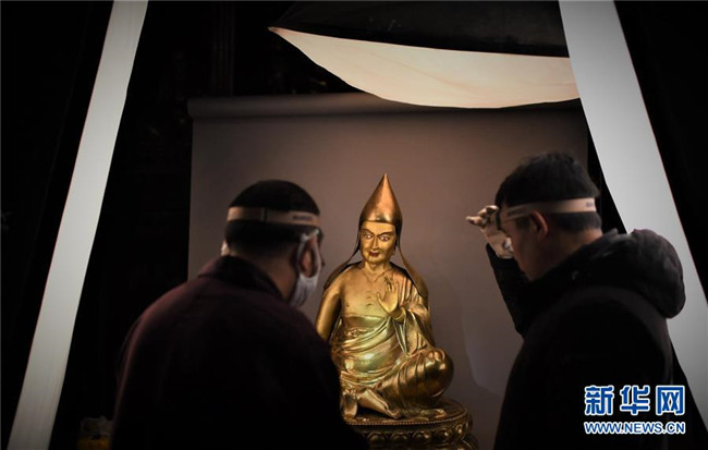 布達(dá)拉宮管理處的工作人員對佛像進(jìn)行數(shù)字化存檔(2018年11月16日攝)。 新華社記者 普布扎西 攝
