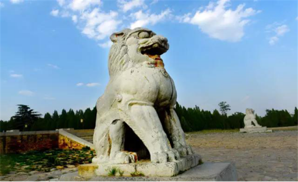 在橋陵的石雕中,特別值得一提的是橋陵的一對石獅子,歷經(jīng)千年的風(fēng)雨侵蝕,可威風(fēng)依然不減當(dāng)年,四肢健壯、昂首挺胸、怒目圓睜,顯示出“天地之間,唯我獨(dú)尊”的傲氣、霸氣,它造型優(yōu)美,氣勢磅礴,體現(xiàn)出唐代粗礦、奔放的時(shí)代氣息,而最讓人叫絕的是它的尾巴,從腿底鉆進(jìn)又掏出來卷曲于背部,動(dòng)物的調(diào)皮可愛活靈活現(xiàn)展現(xiàn)在我們眼前。它是石刻中的精品,石刻的精美,氣魄的宏大,堪稱“東方第一獅”。像這樣的獅子四個(gè)門前都有,保存的特別完好,東門的回頭望,西門的卷舌獅在唐代帝王陵中都是絕無僅有的。