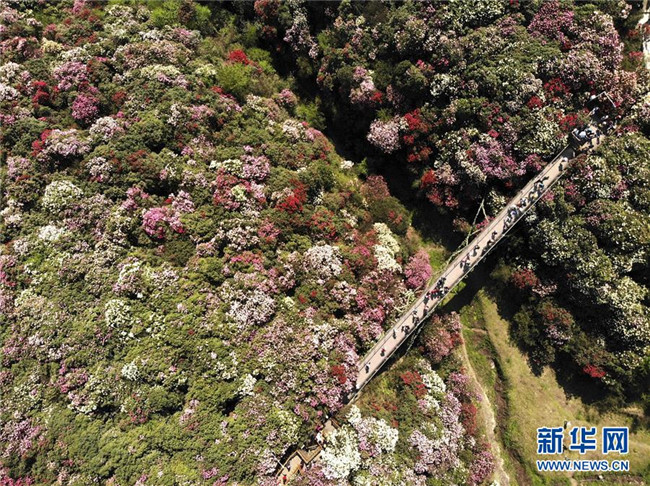 4月7日,游客在貴州省畢節(jié)市百里杜鵑金坡景區(qū)游覽(無(wú)人機(jī)拍攝)。清明時(shí)節(jié),人們外出旅游,踏青賞花,感受春天的美好。 新華社發(fā)(韓賢普 攝)