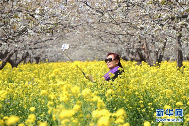 4月6日,在貴州六盤(pán)水盤(pán)州市烏蒙大草原景區(qū),游客在花海中自拍。清明時(shí)節(jié),人們外出旅游,踏青賞花,感受春天的美好。 新華社發(fā)(劉佳躍 攝)