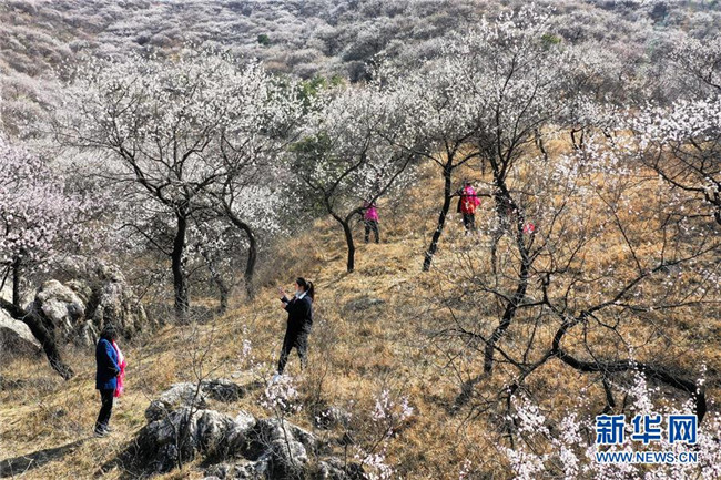 4月7日,游客在河北省遷西縣興城鎮(zhèn)杏花谷參觀(guān)(無(wú)人機(jī)拍攝)。清明時(shí)節(jié),人們外出旅游,踏青賞花,感受春天的美好。 新華社發(fā)(王愛(ài)軍 攝)