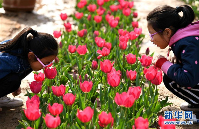 4月7日,在石家莊市植物園,兩名小游客欣賞盛開(kāi)的花朵。清明時(shí)節(jié),人們外出旅游,踏青賞花,感受春天的美好。 新華社發(fā)(陳其保 攝)