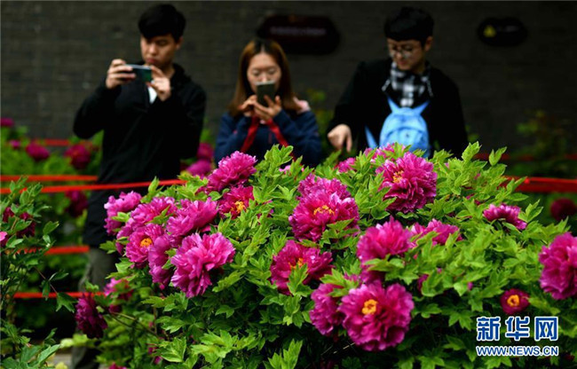 4月13日,游客在石家莊市正定榮國府影視基地游覽拍照。時下,河北石家莊正定榮國府影視基地內的牡丹花次第開放,在春雨的滋潤下顯得格外晶瑩剔透、美麗嬌艷。 新華社發(fā)(陳其保 攝)