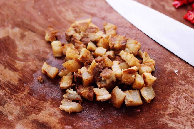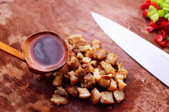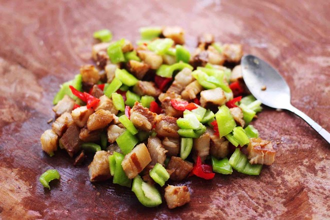 5.把切丁的青紅椒和鹵肉丁用勺子翻拌均勻備用,加點(diǎn)香菜味道會(huì)更好吃哈。