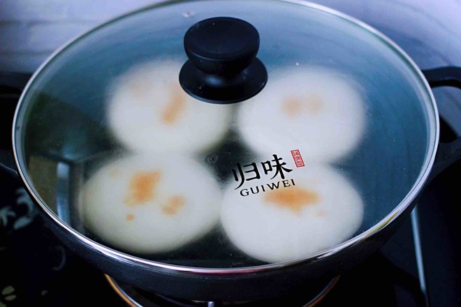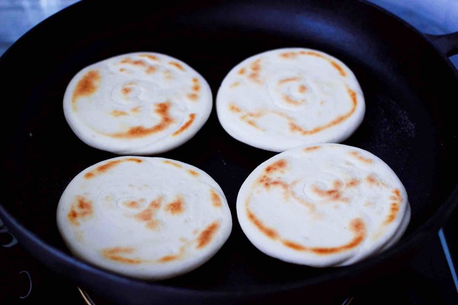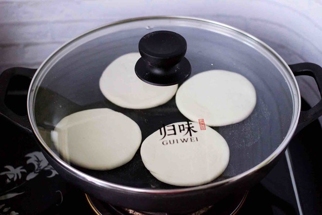 15.把面餅的一面煎至金黃的顏色后,再蓋上鍋蓋煎另一面。