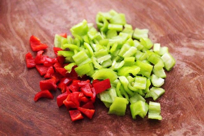 1.首先把青尖椒和紅椒,洗凈后用刀切成小丁備用。