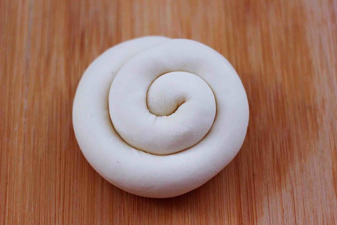 12.然后把長(zhǎng)條從一頭開始卷起,卷到最后把尾端壓在面團(tuán)底下。