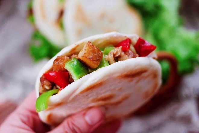 18.把做好饃用刀切開、記住不要切到底喲,把做好的鹵肉丁和青紅辣椒丁夾到饃饃里就可以了。