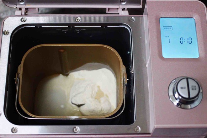 6.面包桶里加入中筋面粉,然后再加入酵母和清水,啟動(dòng)?xùn)|菱面包機(jī)的一個(gè)和面程序。