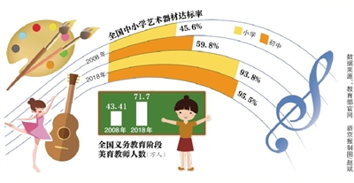 根據(jù)教育部公布的最新數(shù)據(jù),2018年全國小學藝術器材達標率提高到93.8%,初中提高到95.5%;2018年全國義務教育階段美育教師人數(shù)增加到71.7萬人。比10年前有較大幅度提高。