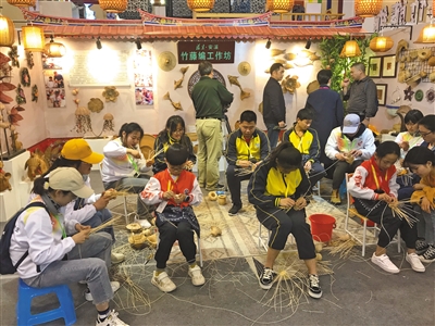 學生藝術實踐工作坊,來自福建安溪的小學生展示竹藤編。記者 馮琪 攝