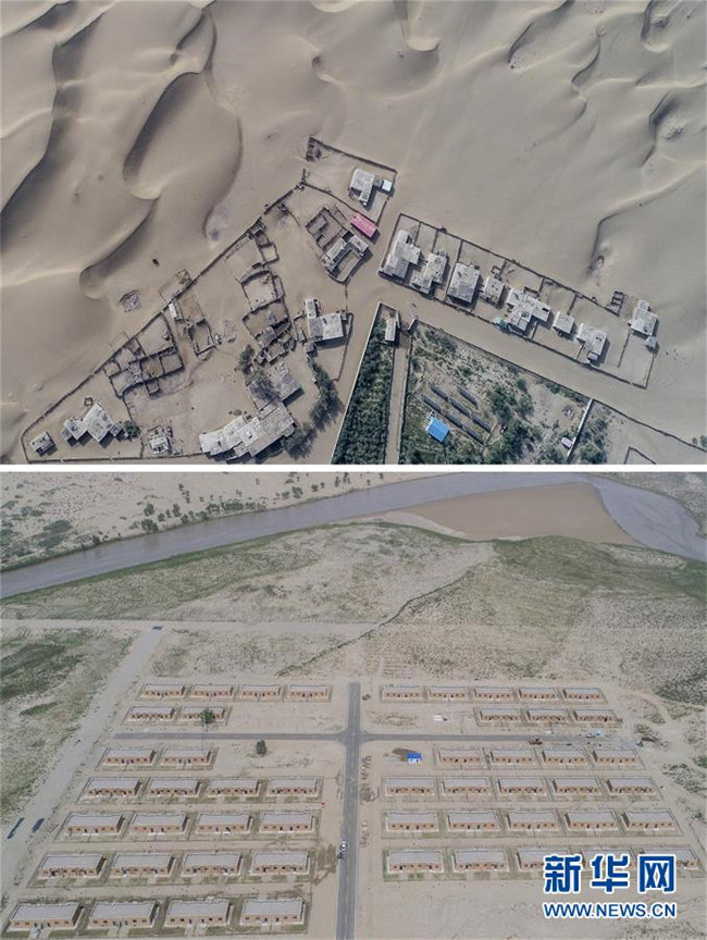 拼版照片:上圖為地處沙漠腹地的新疆于田縣達里雅布依鄉(xiāng)一處村落(2018年9月6日無人機拍攝);下圖為建設中的達里雅布依小鎮(zhèn)易地扶貧安置點(2018年9月8日無人機拍攝)。新華社記者 胡虎虎 攝