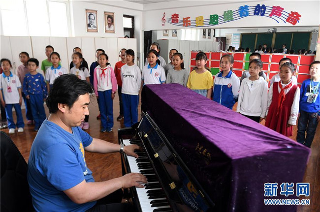 陜西省延安市楊家?guī)X福州希望小學(xué)合唱社團(tuán)的學(xué)生在進(jìn)行合唱(4月24日攝)。