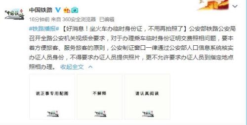 據(jù)中國鐵路總公司官方微博消息,公安部鐵路公安局召開全路公安機(jī)關(guān)視頻會要求,對于辦理乘車臨時身份證明交費(fèi)照相問題,要本著方便旅客、服務(wù)旅客的原則,公安制證窗口一律通過公安部人口信息系統(tǒng)核實辦證人員身份,不得要求辦證人員提供照片,更不允許要求辦證人員到指定地點照相辦理。