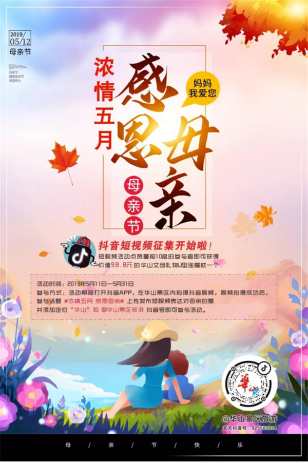 參與方式:5月12日——5月27日活動(dòng)期間打開抖音APP,在華山景區(qū)內(nèi)拍攝抖音短視頻,視頻拍攝成功后,參與話題 #濃情五月 感恩母親# 上傳發(fā)布短視頻表達(dá)對(duì)母親的愛,并添加定位“華山”和 @華山景區(qū)旅游 官方抖音號(hào)(925503834)即可參與活動(dòng)。