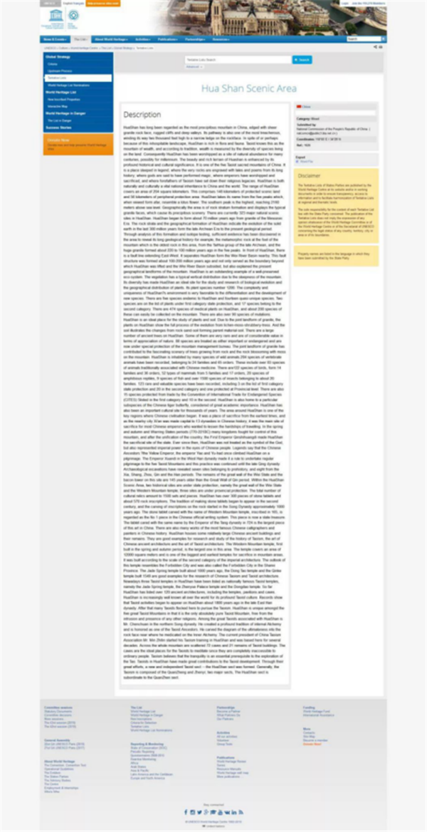 聯(lián)合國教科文組織官網(wǎng)華山篇網(wǎng)頁截圖
