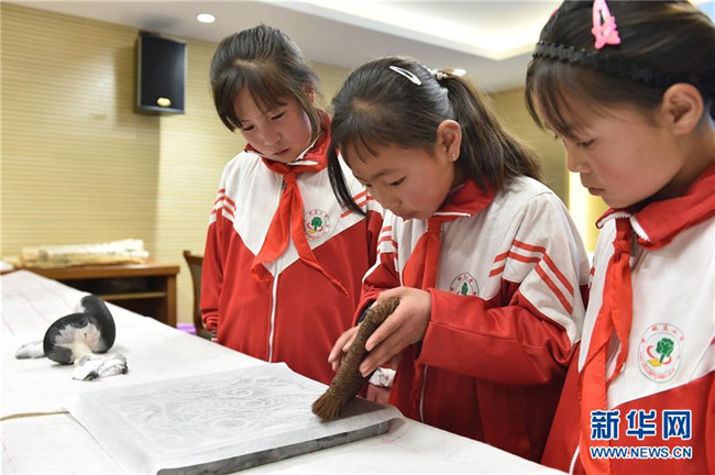 5月31日,學(xué)生們?cè)趯幭墓淘┪镳^體驗(yàn)拓印。新華社記者 唐亞蒙 攝