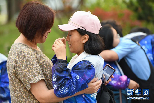 6月9日,合肥市第三十五中學(xué)西藏班的初三畢業(yè)生(右)與老師告別時落淚。