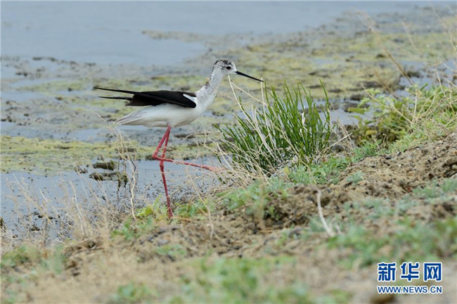 6月9日,一只長腿鷸在新疆烏倫古湖國家濕地公園覓食。新華社記者 丁磊 攝