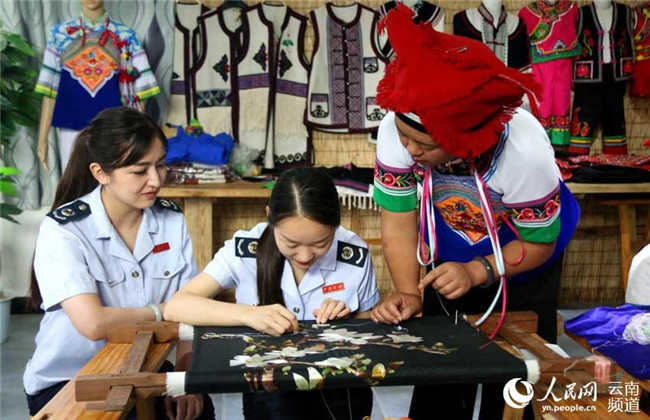 6月18日,恰逢硯山縣稅務(wù)局上門服務(wù),王陸芬教稅務(wù)人員刺繡。攝影:陸安恒