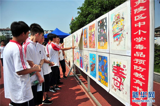 6月26日,湖北省宜昌市夷陵區(qū)東湖高中的學生觀看毒品預防教育書畫展。 新華社發(fā)(張國榮攝)
