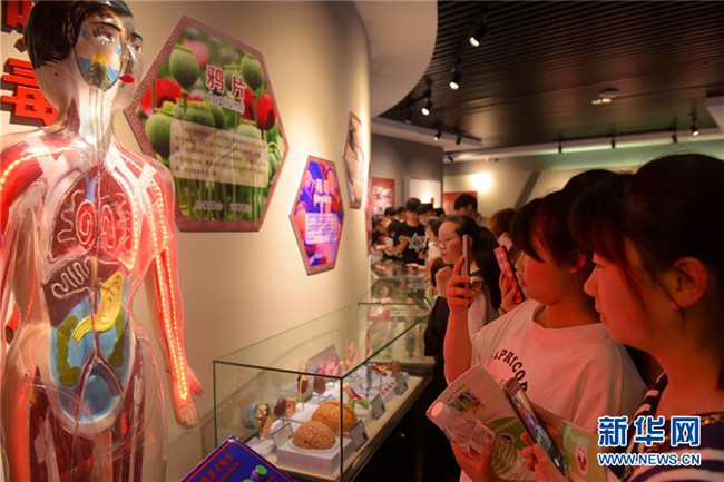 6月26日,在湖北省宣恩縣未成年人法治教育和禁毒警示教育基地,學生通過人體模型了解吸食毒品的危害。新華社發(fā)(王俊攝)